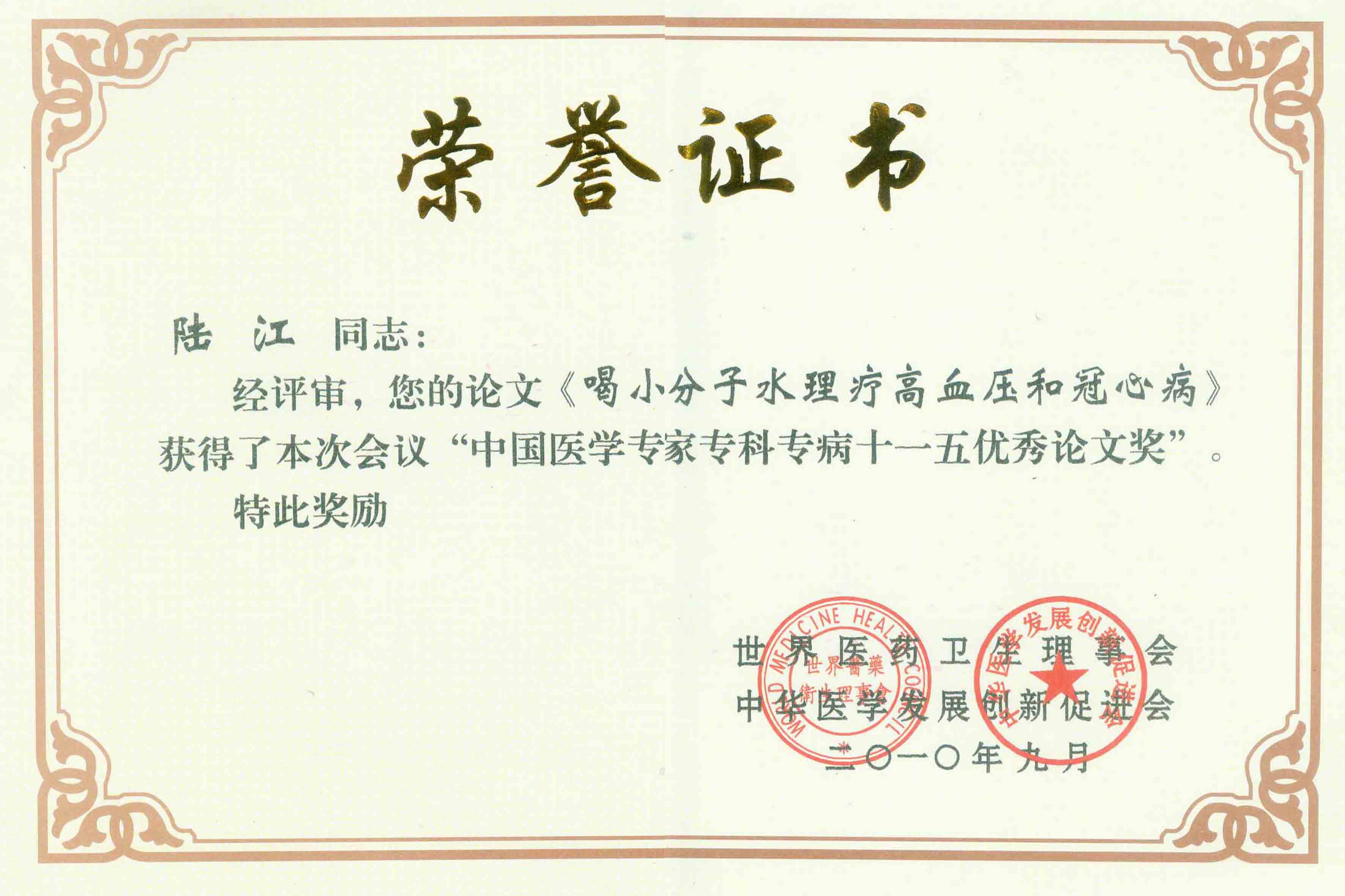 《飲用小分子水治療高血脂》獲優(yōu)秀論文獎